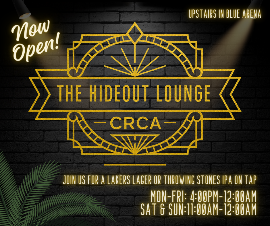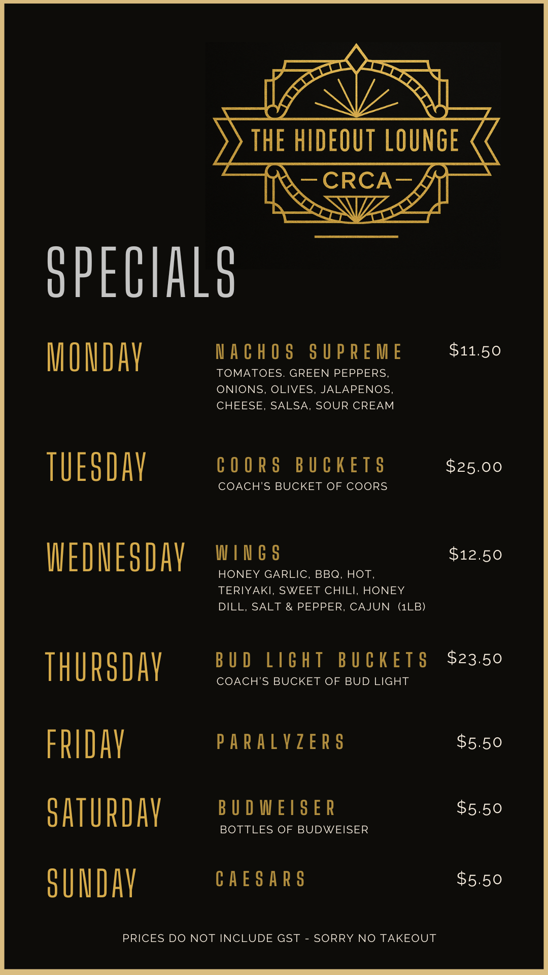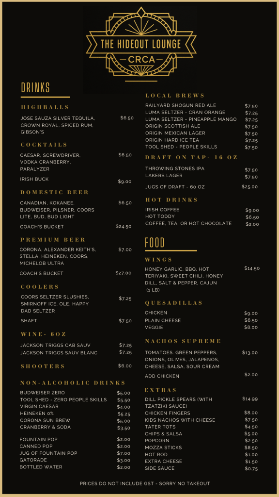 The Hideout Lounge Welcome to our Lounge Located just upstairs above the blue rink Please see below for our hours, menus and daily specials To book a private function, Please reach out to the CRCA Office for prices and availability 403-272-7170 The Hideout Lounge – Menu (1)