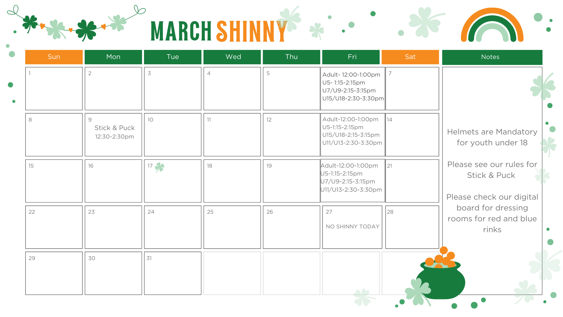 Please review the schedule and only come to your assigned age division. Note that we rotate age divisions each week so there is not shinny for all ages each week. Have fun & play safe!